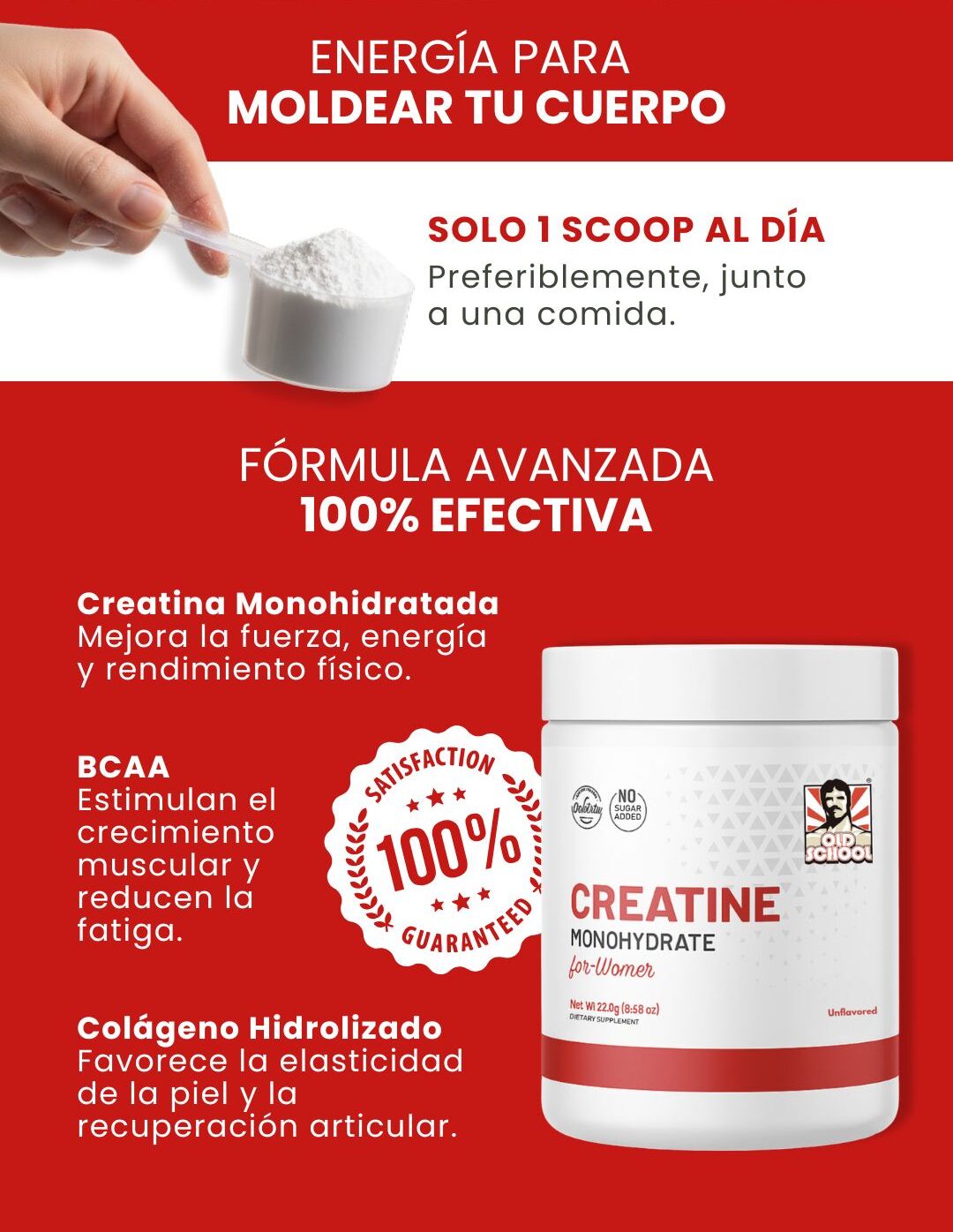 Esta fórmula está diseñada especialmente para mujeres, combinando creatina pura con colágeno y BCAA para mejorar el rendimiento, la tonificación y el cuidado articular.